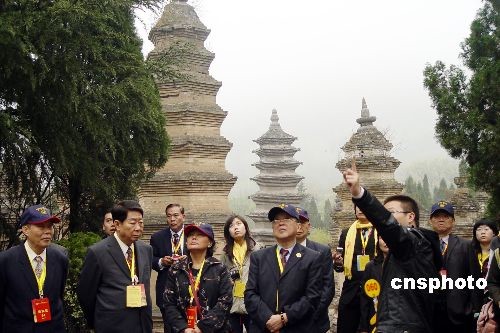 四月八日,黃埔老兵們在河南少林寺塔林參觀。當(dāng)日,由臺灣及大陸近百名退役將軍組成的“海峽兩岸百名將軍黃帝故里拜祖大典”參訪團(tuán)在河南嵩山少林寺參觀訪問。中新社發(fā) 李志全 攝