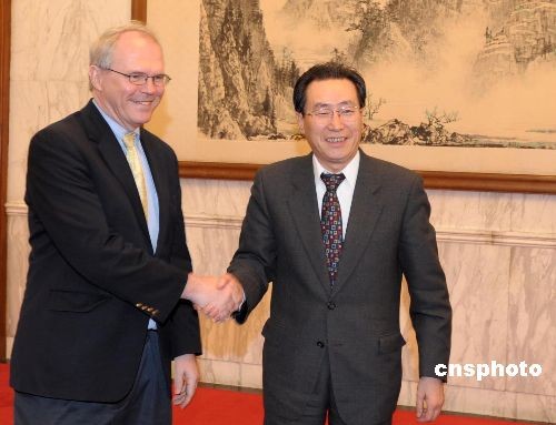 四月九日,朝核問(wèn)題六方會(huì)談在北京舉行團(tuán)長(zhǎng)會(huì),中國(guó)代表團(tuán)團(tuán)長(zhǎng)武大偉與美國(guó)代表團(tuán)團(tuán)長(zhǎng)希爾(左)在釣魚臺(tái)國(guó)賓館會(huì)晤。中新社發(fā) 廖攀 攝