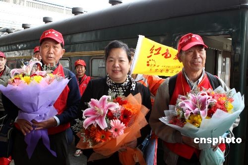 4月10日,2008年首列紅色旅游專列從廣東梅州市抵達天津,1000多名由退休老人組成的旅行團將走訪天津及北京主要紅色旅游景點,同時標志著“紀念三大戰(zhàn)役勝利60周年系列主題活動”正式啟動。中新社發(fā) 趙雋 攝