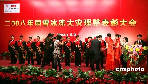 中國人民財產(chǎn)保險股份有限公司(PICC)在北京舉行2008年雨雪冰凍大災理賠表彰大會,對該公司在此次大災理賠工作中取得突出成績的單位(集體)和個人進行表彰。中新社發(fā) 楊可佳 攝