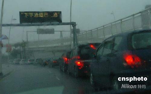三條通往凼仔的大橋路面封閉,西灣大橋下層通道(封閉車道)開通,過(guò)橋車輛排成長(zhǎng)龍。中新社發(fā) 史利 攝