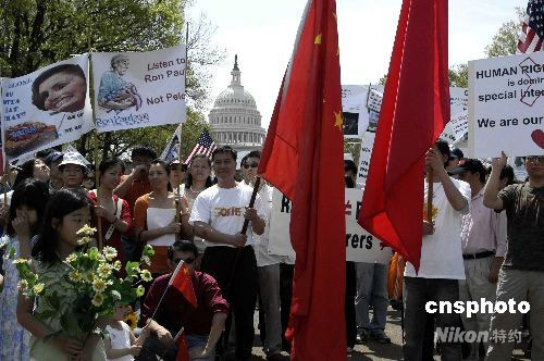 當(dāng)?shù)貢r(shí)間4月19日,近千名中國留學(xué)生和當(dāng)?shù)氐娜A僑華人在美國國會(huì)山前舉行示威活動(dòng),支持北京奧運(yùn),反對(duì)CNN丑化中國的評(píng)論。圖為千名留學(xué)生在國會(huì)山前振臂高呼:“不要歪曲報(bào)道!不要支持暴力!支持和平,支持奧運(yùn)!” 中新社發(fā) 邱江波 攝