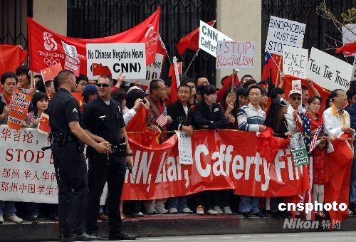 當(dāng)?shù)貢r間4月19日,洛杉磯爆發(fā)十幾年來最大規(guī)模的華人華僑抗議示威活動。數(shù)千名華人華僑和留學(xué)生在CNN洛杉磯分部門前參加和平示威,要求CNN向公開鄭重道歉,并開除卡弗蒂。示威活動自始至終秩序井然,現(xiàn)場執(zhí)勤警察一臉輕松。中新社發(fā) 張煒 攝