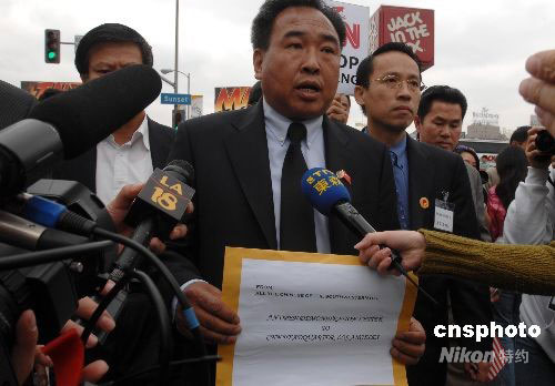 當(dāng)?shù)貢r(shí)間4月19日上午,示威活動(dòng)現(xiàn)場(chǎng)總指揮陳軍(中)準(zhǔn)備向CNN遞交抗議信,但最終CNN方面無人出面接受抗議書。洛杉磯當(dāng)天爆發(fā)十幾年來最大規(guī)模的華人華僑抗議示威活動(dòng)。數(shù)千名華人華僑和留學(xué)生在CNN洛杉磯分部門前參加和平示威,要求CNN向公開鄭重道歉,并開除卡弗蒂。中新社發(fā) 張煒 攝
