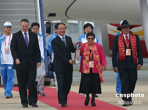 圖為北京奧組委執(zhí)行副主席蔣效愚(左二)與澳大利亞原住民大酋長艾格尼斯夫人(右二)在機(jī)場共舉奧運(yùn)圣火燈。 作者: 沈晨