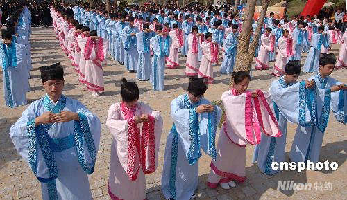 4月27日,福建閩侯縣首屆傳統(tǒng)漢服成年禮活動在福州曇石山博物館舉行,300名中學(xué)生身著傳統(tǒng)漢服出席。整個成年禮儀活動按傳統(tǒng)禮儀進行,分為加冠、加笄、成人宣誓、敬師長等環(huán)節(jié),是目前福建規(guī)模最大的傳統(tǒng)漢服成年禮活動。中新社發(fā) 劉可耕 攝