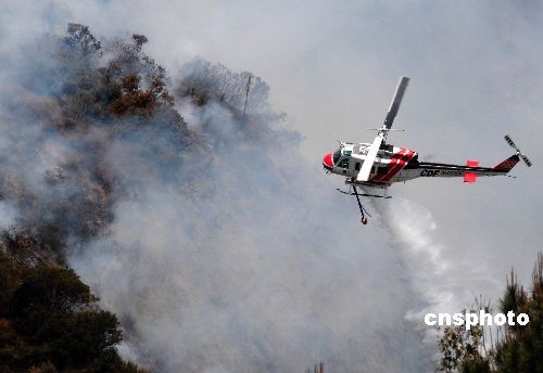 當?shù)貢r間四月二十八日,消防直升機正在向著火區(qū)域撒下阻燃劑。中新社發(fā) 張煒 攝