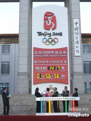 2004年9月21日18時(shí)整,二零零八年北京奧運(yùn)會(huì)“倒計(jì)時(shí)鐘”在中國(guó)國(guó)家博物館門前豎起。史利 攝