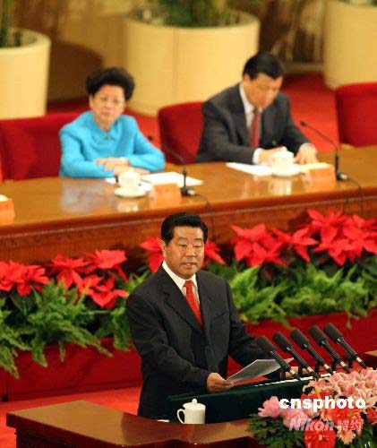 賈慶林在北京奧運(yùn)會(huì)倒計(jì)時(shí)100天誓師大會(huì)上致辭。中新社發(fā) 任海霞 攝
