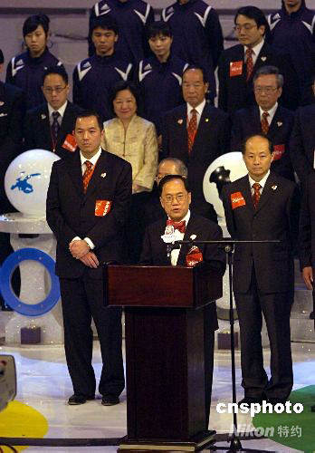 曾蔭權在“北京奧運倒數(shù)一百天”晚會上致詞。中新社發(fā) 譚達明 攝