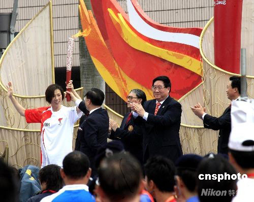 香港滑水風帆奧運冠軍李麗珊接過特區(qū)行政長官曾蔭權(quán)手中的奧運火炬開始第一棒火炬?zhèn)鬟f。