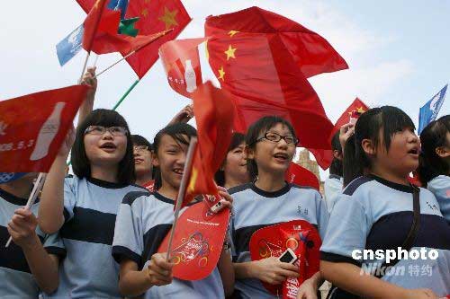 圖為學(xué)生們在街頭為傳遞活動(dòng)加油助威。中新社發(fā) 武仲林 攝