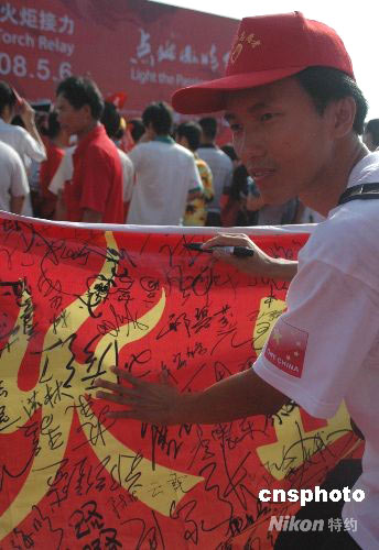一名?谇嗄曛驹刚咴谥С謯W運的條幅上簽字。 中新社發(fā) 王辛莉 攝