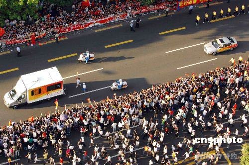 奧運(yùn)火炬經(jīng)過市區(qū)深南大道受到兩旁市民熱情追逐。 中新社發(fā) 陳文 攝