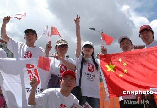 奧運(yùn)圣火成功登上珠峰后,拉薩街頭一片歡騰,市民歡天喜地奔走相告。中新社發(fā) 周波 攝