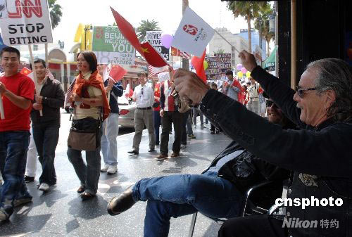 當(dāng)?shù)貢r(shí)間5月10日,通過網(wǎng)絡(luò)自發(fā)組織的南加州數(shù)百名華人華僑、留學(xué)生在洛杉磯著名的好萊塢星光大道上參加支持北京奧運(yùn)集會(huì)游行活動(dòng)。游行活動(dòng)在歡歌笑語中進(jìn)行,沿途受到一些洛杉磯市民的支持和響應(yīng)。 中新社發(fā) 張煒 攝