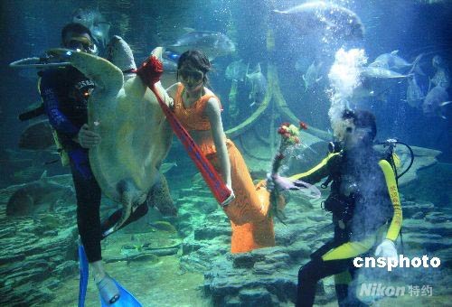 5月11日,在武漢東湖海洋世界,一只百歲雌性海龜“披紅掛彩”,“接受”潛水員獻(xiàn)上的康乃馨和“美人魚”的親吻,歡度“母親節(jié)”。中新社發(fā) 王振武 攝