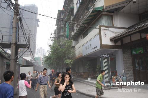 5月12日14時28分,在四川汶川縣(北緯31度,東經(jīng)103.4度)發(fā)生7.8級地震,四川省會成都有強烈震感,市民緊急從建筑物中跑出來,在街道上緊急避險,全城交通因此受阻。 中新社發(fā) 鄒輝 攝