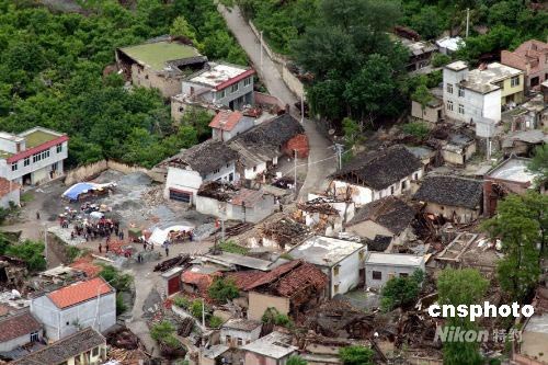 5月14日,空中拍攝的汶川縣城一角。成都軍區(qū)某陸航團(tuán)四架直升機(jī)滿載帳篷、礦泉水等災(zāi)區(qū)急需物資抵達(dá)四川大地震震中汶川縣,并在返回時將第一批40名重傷員隨機(jī)送抵成都的醫(yī)院救治。中新社發(fā) 張雷 黃龍 攝