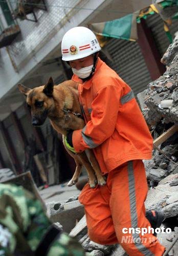 組圖:消防搜救隊員抱搜救犬進救災(zāi)現(xiàn)場(2)