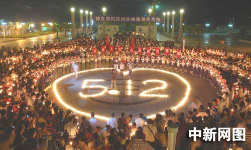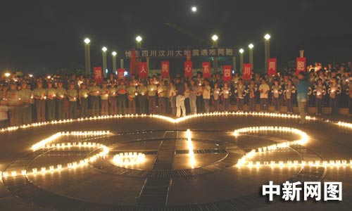 5月20日是全國(guó)哀悼日三天中的第二天,在浙江溫州市百島洞頭新城廣場(chǎng)上,洞頭縣消防大隊(duì)的官兵們點(diǎn)燃祭奠逝者的燭臺(tái),擺放成含有5月12日標(biāo)志的心型,讓5月12日不幸遇難的同胞以及為了災(zāi)區(qū)安危舍身救人的消防官兵,為中國(guó)所銘記。哀傷的氣氛在廣場(chǎng)彌漫,廣場(chǎng)上的人們默默地守護(hù)著自己手中的燭光,低頭默哀,他們希望通過(guò)這種方式將地震遇難同胞通往天堂的路照亮,將受災(zāi)地區(qū)抗災(zāi)自救的路照亮。(江耘 林加佳 林加杰)