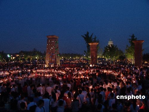 2008年5月19日晚,在西安大雁塔北廣場(chǎng),上萬市民手持蠟燭自發(fā)為在汶川大地震中遇難的同胞們致哀。
