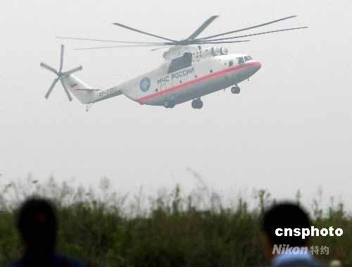 5月25日下午5時(shí)45分,俄羅斯米格—26大型運(yùn)輸機(jī)飛抵綿陽機(jī)場(chǎng),支援唐家山堰塞湖排險(xiǎn)工作。中新社發(fā) 趙振清 攝