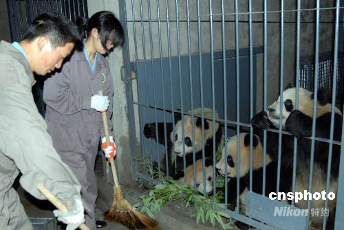 5月24日,來自四川臥龍的8只大熊貓平安抵達(dá)北京動(dòng)物園,開始新的生活。圖為管理員在清掃圈舍。中新社發(fā) 羅小韻 攝