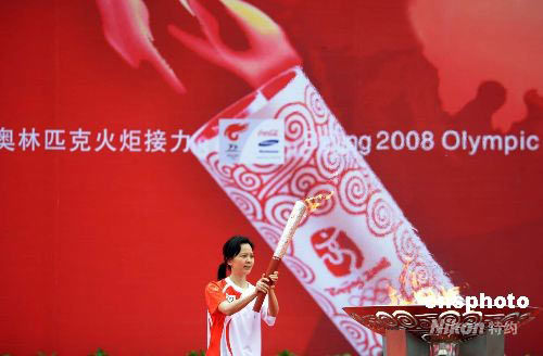 5月28日,合肥籍武術(shù)項目世界冠軍范雪平點燃奧運火炬?zhèn)鬟f合肥站結(jié)束儀式上的圣火盆。中新社發(fā) 廖攀 攝