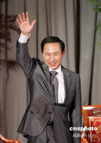 圖為韓國總統(tǒng)李明博在北大演講時(shí)向臺(tái)下學(xué)生揮手示意。中新社發(fā) 張宇 攝