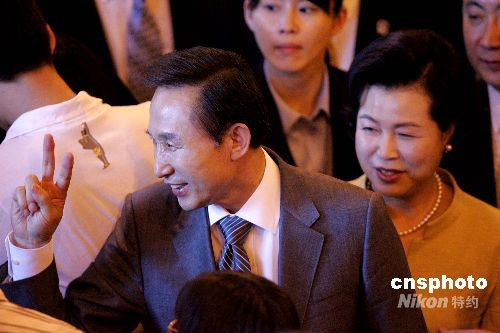 圖為韓國總統(tǒng)李明博在北京大學發(fā)表演講后,向為其拍照的學生們擺POSS。中新社發(fā) 張宇 攝
