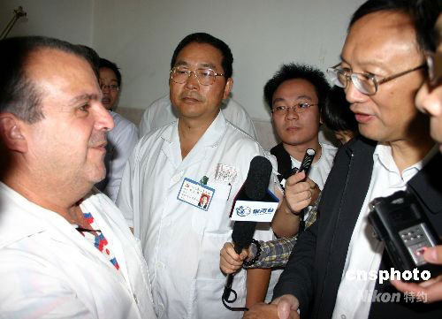 5月30日上午,中國(guó)外交部部長(zhǎng)楊潔篪來到四川省人民醫(yī)院,看望在這里救治地震災(zāi)區(qū)傷病員的古巴醫(yī)療隊(duì),感謝他們給予四川地震災(zāi)區(qū)民眾的關(guān)心,并高度贊揚(yáng)了他們的國(guó)際人道主義精神。中新社發(fā) 楊杰 攝