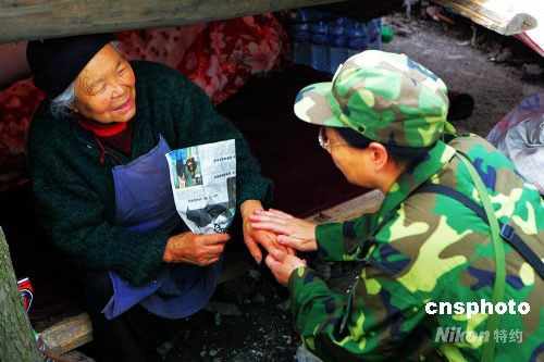 廣州軍區(qū)武漢總醫(yī)院心理專家為帳篷內一老人撫手做心理輔導。中新社發(fā) 徐維鴻 攝
