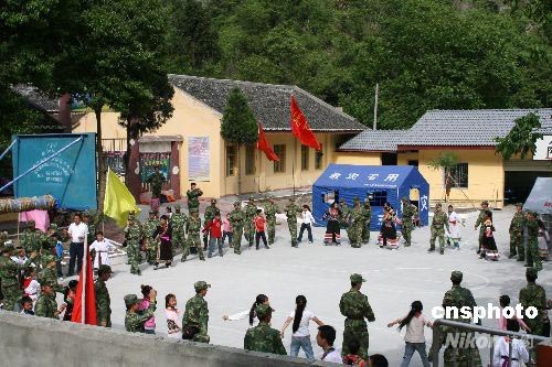 5月29日,“六一”兒童節(jié)前夕,四川省平武縣木座藏族鄉(xiāng)中心小學(xué)學(xué)生和駐扎在木座藏族鄉(xiāng)的濟(jì)南軍區(qū)某紅軍團(tuán)官兵一起聯(lián)歡。5月16日,這個(gè)紅軍團(tuán)從湖北省孝感縣千里機(jī)動(dòng)來(lái)到這里,官兵們顧不上休息就展開救援工作。木座藏族鄉(xiāng)的十幾個(gè)村小組,分布在700多平方公里的山谷大川中,官兵們分成30多個(gè)搜救小分隊(duì),深入到各個(gè)山溝村寨營(yíng)救幸存者、拆除危房、搭建帳篷小學(xué)、設(shè)立救助站,使1700多人有了溫馨的家。圖為紅軍團(tuán)官兵與木座藏族鄉(xiāng)中心小學(xué)師生跳起 “團(tuán)結(jié)舞”。中新社發(fā) 虞平 攝