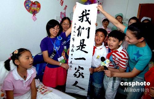 5月31日,來福州參加“海峽兩岸手拉手藝術(shù)節(jié)”的臺(tái)灣澎湖馬公小學(xué)音樂班的洪儀庭、許宜彙、林宏珍3位同學(xué)與福州小朋友,一起來到南京軍區(qū)福州總醫(yī)院愛心病房,與在這里接受治療的四川地震災(zāi)區(qū)的小朋友共同舉行一場(chǎng)別開生面的聯(lián)歡活動(dòng),提前歡度“六一”兒童節(jié)。中新社發(fā) 劉可耕 攝