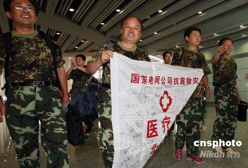 6月1日,國(guó)家電網(wǎng)公司抗震救援隊(duì)和北京電力醫(yī)院抗震救援醫(yī)療隊(duì)從災(zāi)區(qū)回到北京。中新社發(fā) 錢興強(qiáng) 攝