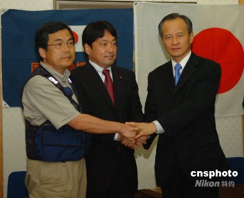 6月2日晚間,日本國(guó)際緊急援救隊(duì)結(jié)束為期兩周的在中國(guó)汶川地震災(zāi)區(qū)醫(yī)療援助活動(dòng)返回東京,受到中國(guó)駐日大使崔天凱等中國(guó)駐日使館官員、在日華人華僑留學(xué)生的熱烈歡迎。圖為崔天凱與前來(lái)迎接醫(yī)療隊(duì)歸國(guó)的日本外務(wù)副大臣小野寺五典(中)、醫(yī)療隊(duì)團(tuán)長(zhǎng)田尻和宏(左)。中新社發(fā) 朱沿華 攝