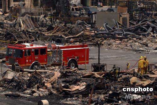 當地時間六月二日,消防員在火災廢墟現場處理善后。一日凌晨,洛杉磯著名的環(huán)球影城發(fā)生大火,持續(xù)十幾個小時的大火焚毀了影城部分外景設施,備受游客喜愛的主題公園“金剛”景點也被付之一炬,過火面積約三點五英畝。中新社發(fā) 張煒 攝