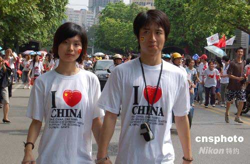 一對年輕情侶牽手街頭迎接奧運(yùn)圣火。中新社發(fā) 劉萬強(qiáng) 攝