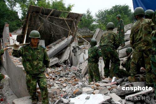 6月8日,中國(guó)空降兵某部“常勝模范連”所在團(tuán)官兵,進(jìn)村入戶之后,在四川省什邡市鎣華鎮(zhèn)幫助受災(zāi)群眾清理廢墟,搭建臨時(shí)過渡房。中新社發(fā) 譚超 攝