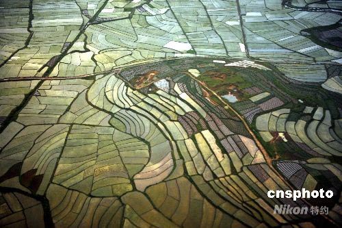 6月10日,奧運(yùn)圣火將在云南麗江進(jìn)行傳遞。6月9日,從飛機(jī)上俯瞰麗江碧綠的農(nóng)田仿如翡翠。中新社發(fā) 廖攀 攝