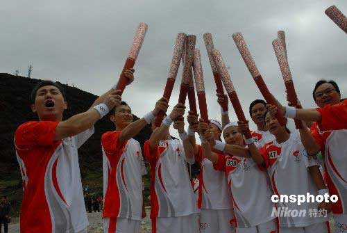 在圣火傳遞結(jié)束儀式的現(xiàn)場,已經(jīng)傳遞完成的10余位火炬手高舉祥云火炬齊聲為中國加油,祝福北京奧運。 中新社發(fā) 石雨 攝