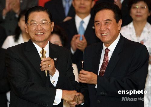 峽兩岸關(guān)系協(xié)會會長陳云林(右)與臺灣海峽交流基金會董事長江丙坤在簽署“兩岸周末包機(jī)”和“大陸居民赴臺旅游”協(xié)議后,交換簽字筆。中新社發(fā) 任晨鳴 攝