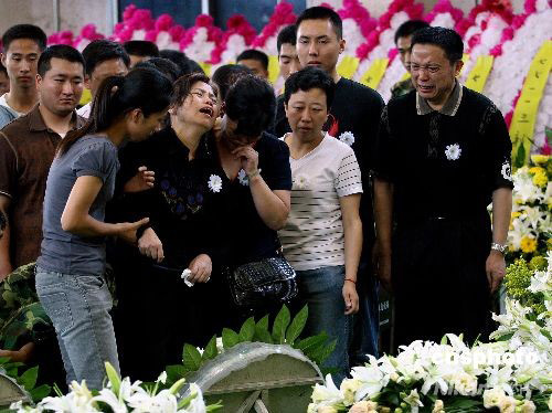 6月13日,四川大地震救援中失事直升機遇難機組人員遺體告別儀式在成都市殯儀館舉行,來自軍方及社會各界的人士紛紛前來送別英雄。圖為遇難機組人員家屬悲痛欲絕送別親人。中新社發(fā) 劉新 攝