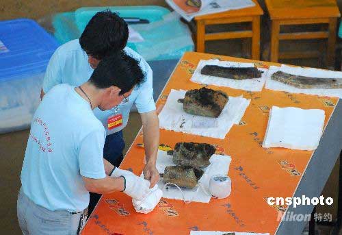 考古人員在對提取上來的青銅器進行簡單處理。中新社發(fā) 從啟 攝