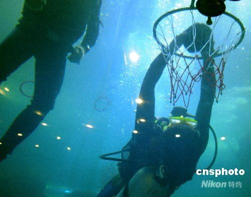 六月二十八日晚,在青島海底世界舉行了一場“中國加油——二00八海底奧運城市爭霸賽”,吸引了來自濟南、青島、濰坊、日照、南京五市的城市代表隊參賽。圖為選手在水下做高難度的扣籃動作。中新社發(fā) 曲連遵 攝