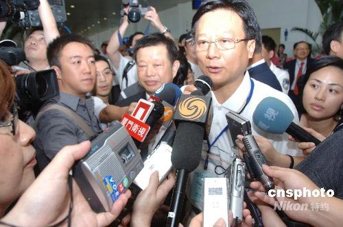 7月4日,臺(tái)灣彰化縣長(zhǎng)卓伯源先生搭乘華信航空的周末包機(jī)從臺(tái)中甫抵廈門(mén),即在機(jī)場(chǎng)接受蜂擁而至的記者集體采訪。中新社發(fā) 鄭祚聲 攝