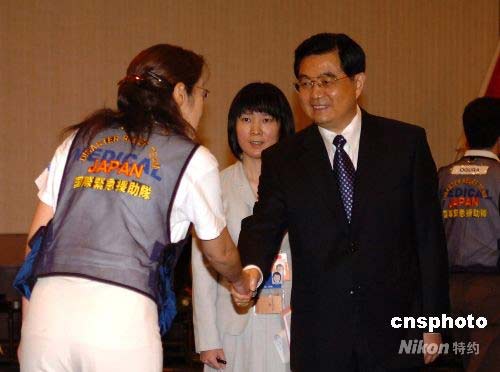 7月8日上午,中國國家主席胡錦濤在札幌會(huì)見日本國際救援隊(duì)和醫(yī)療隊(duì)的部分成員代表,并代表中國政府和人民向他們在四川大地震中給予的幫助和支援表示感謝。圖為胡錦濤與日本醫(yī)療隊(duì)、救援隊(duì)成員一一親切握手。中新社發(fā) 朱沿華 攝