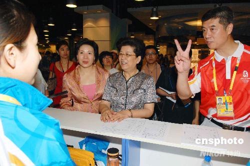 圖為全國人大常委會(huì)副委員長、北京奧組委副主席陳至立參觀主新聞中心記者工作區(qū)。 中新社發(fā) 陳文 攝
