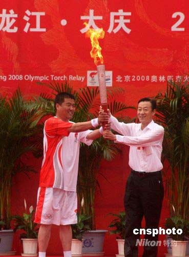 7月12日,北京奧運(yùn)火炬在“石油之城”大慶傳遞,“鐵人鉆井隊(duì)”第19任隊(duì)長胡志強(qiáng)(左)從大慶市委書記韓學(xué)鍵手中接過第一棒火炬。 中新社發(fā) 周兆軍 攝